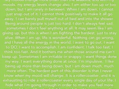 I saw this on Facebook. This is an extremely good description of how my bipolar disorder affects me.